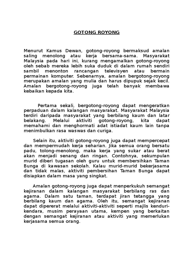 Laporan Add to my workbooks 8 Download file pdf Embed in my website or blog Add to Google Classroom. Menurut Kamus Besar Bahasa Indonesia KBBI gotong royong adalah bekerja bersama-sama atau tolong menolong. Contoh Penulisan Ulasan Karangan Aktiviti Gotong Royong Sekolah.